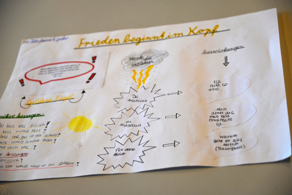 Schülerinnen und Schüler des sechsten Jahrgangs sammelten Schimpfwörter in den Fächern Religion und Werte und Normen. Sie überlegten gemeinsam deren Bedeutungen und was sie bei den Mitmenschen anrichten können. Schnell wurde klar, dass jeder so behandelt werden möchte, wie er auch andere behandeln sollte und dass Frieden bereits im Kopf beginnt.