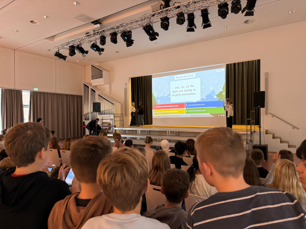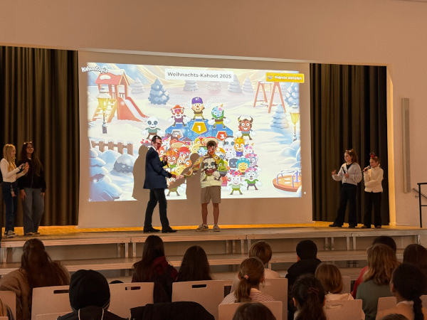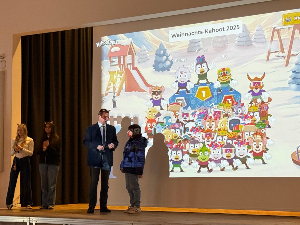 Im Rahmen des lebendigen Adventskalenders veranstaltete die Homepage-AG auch in diesem Jahr ein Weihnachts-Kahoot. Zahlreiche Schülerinnen und Schüler nahmen mit ihren mobilen Endgeräten in der Aula teil. Auf dem Programm standen knifflige und lustige Fragen zu Weihnachten sowie zur Schule.