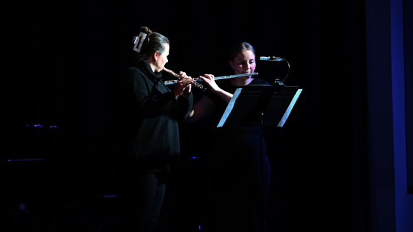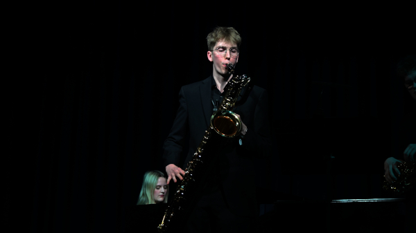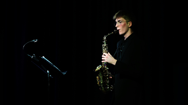 Klassisch ging es mit dem Concertino op. 78 von J.B. Singelèe weiter, was der Solist Julius Schmitz am Saxophon spielte. Das Querflöten-Duett Elisabeth Witt, die von ihrer Instrumentallehrerin begleitet wurde, spielte ein Konzert für 2 Flöten in G-Dur von Wolfgang Amadeus Mozart. Der „Danse macabre“ von Camille Saint-Säens wurde auf der Bühne von Schülerinnen und Schüler der Tanzakademie am Meer vertanzt. Mit der Consolation Nr.3 von Franz Liszt wurde das Klavier wieder hervorgeholt, dem Vivien Chen wohlklingende Töne entlockte. Der ehemalige Schüler Josef Gauk wurde von Elisabeth Witt am Klavier begleitet und spielte das Stück „Salut d`Amour“, einen Liebesgruß von Edvard Grieg. Ebenfalls begeisterte Maria-Theresia Paetz das Publikum mit dem 3. Satz des Konzertes in G-Dur von Giovanni Battista Pergolesi. Das „BigBand Ensemble“ präsentierte das Stück „Jazz Straßbourg“ von St. Dennis. Den Abschluss bildete ein „Quartett“ mit Benjamin Reiss, Mika Conrads und den zwei ehemaligen Schülern Alex Buss und Friedrich Struß.