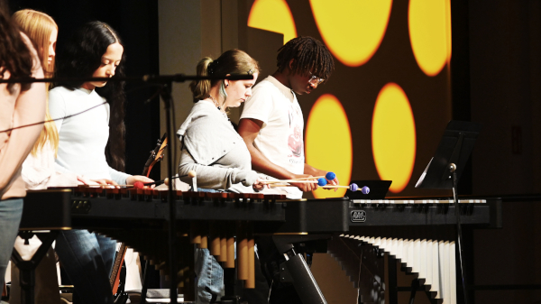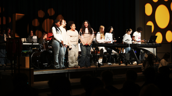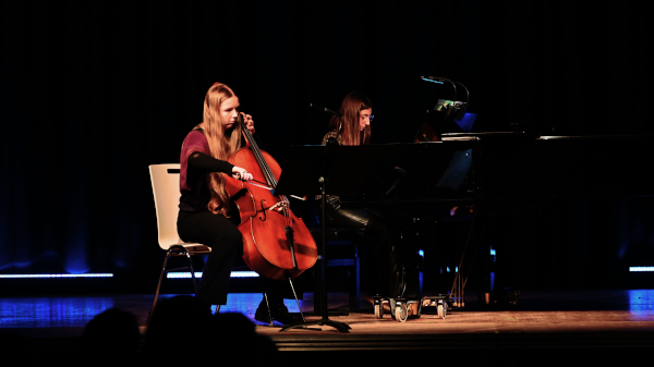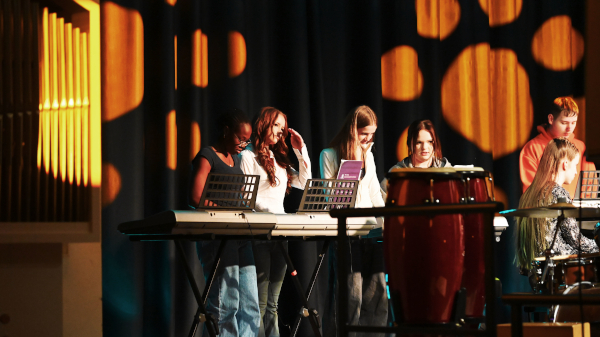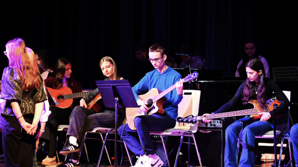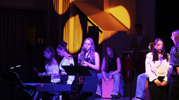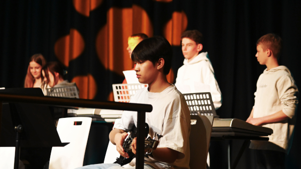 Dieser Abend, der viel Abwechslung versprach, wurde mit dem Wahlpflichtkurs Musik/Kunst des 9. Jahrgangs eingeleitet, der unter Leitung von Frau Linster das Stück „What was I made for“ von Billie Eillish präsentierte. Nach der Begrüßung von Frau Meyer-Rasche, die betonte, wie musikalisch das diesjährige Schuljahr ist, setzte der Wahlpflichtkurs Musik/Kunst des 10. Jahrgangs den Abend mit seinem Stück „Mercy“ von Shawn Mendes, das unter Herrn Berners Leitung entstanden ist, fort. Außerdem führte der 10. Jahrgang das Publikum mit seiner Moderation durch den Abend. Mit dem Trio, bestehend aus Gesang, Klavier und Schlagzeug, präsentierten Chanelle, Elisabeth und Marlek das Stück „From the Stars“ von Laufey. Mit ihrer Eigenkomposition „Da Rien“ zog Helin Ersu das Publikum in ihren Bann. Außerdem begleitete sie Josefa Stolle, die auf dem Cello „Status“ von Harry Potter spielte. Mit dem Euphonium präsentierte Emma Cornelius das Stück „Finlandia“ von Jean Sibelius. Auch Piet Lange zeigte auf der Trompete mit dem Stück „Blowin in the Wind“ von Bob Dylan sein Können. Mit seinem Schlagzeugsolo begeisterte Marlek Dopmeyer das Publikum, der das von William Kraft arrangierte Stück „Moris Dance“ vorspielte.