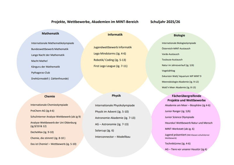 Das Neue Gymnasium Wilhelmshaven ist seit 2020 ausgezeichnete MINT-Excellence Schule und damit Teil des nationalen Excellence-Netzwerks von Schulen mit Sekundarstufe II und hervorragendem mathematisch-naturwissenschaftlich-technischen Schulprofil. Als Leuchtturm-Schule im MINT-Bereich fördern wir in zahlreichen vielfältigen Angeboten die Begabungen und Talente unserer SchülerInnen im MINT- Bereich. Hierzu bieten wir u.a. naturwissenschaftliche Schwerpunktklassen, MINT-Profile, AGs, Lernbüros, Wettbewerbe und Projekte an. Ebenso finden sich zahlreiche MINT-Akademien - die ein ausgesprochenes Alleinstellungsmerkmal unserer Schule sind - und internationale MINT-Austauschprojekte (u.a. mit Tokio), die das umfangreiche MINT-Portfolio des NGW bilden. Bedarfsgerechte, individuelle MINT-Förderung für Ihr Kind!