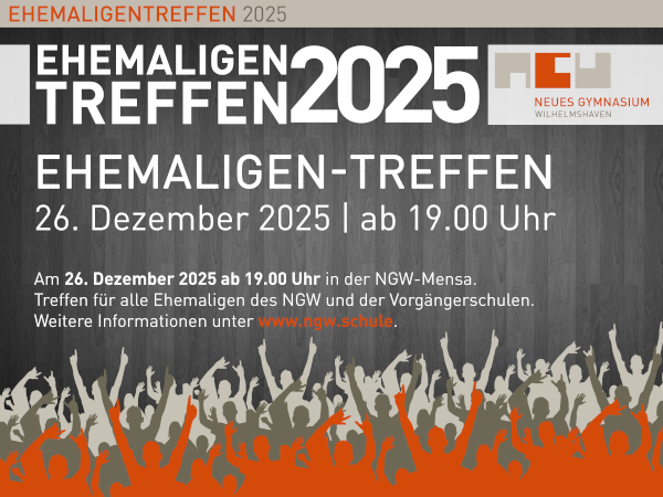 Am 26. Dezember 2026 findet das Ehemaligentreffen am NGW um 19 Uhr in der Mensa statt.